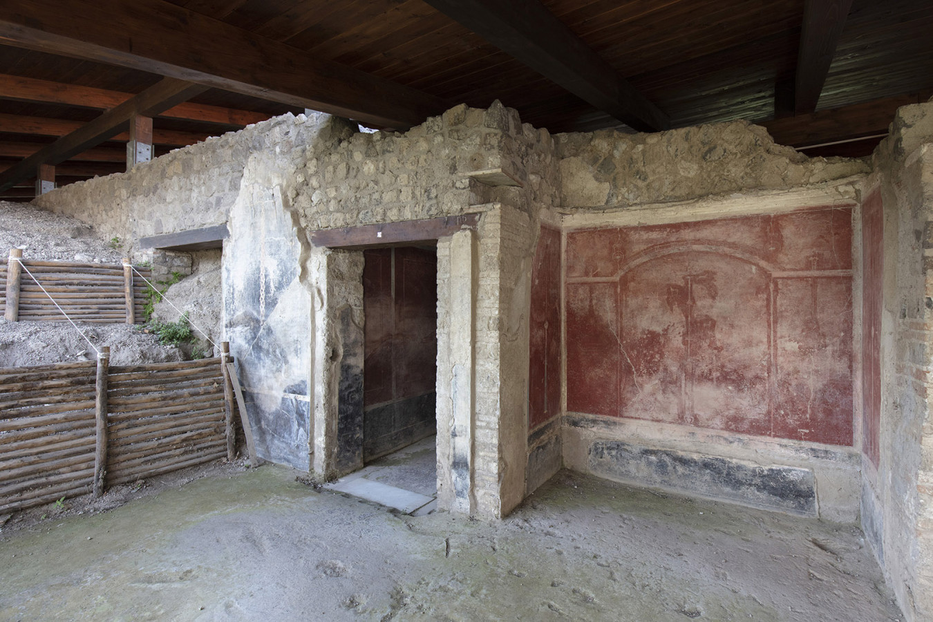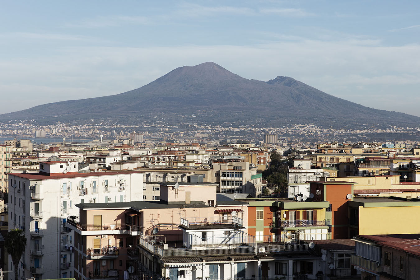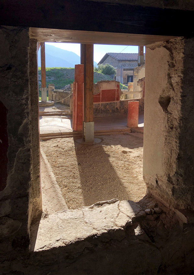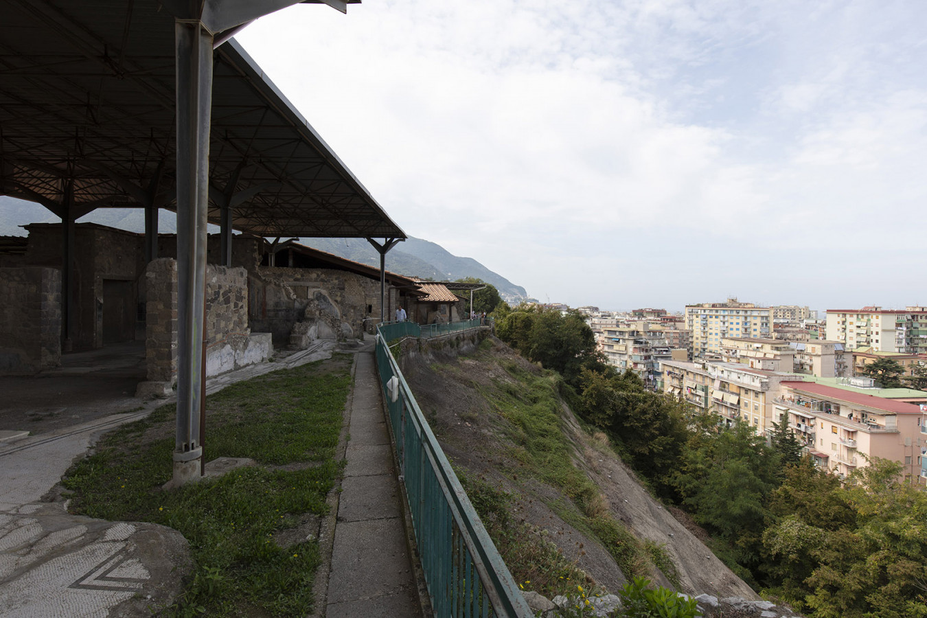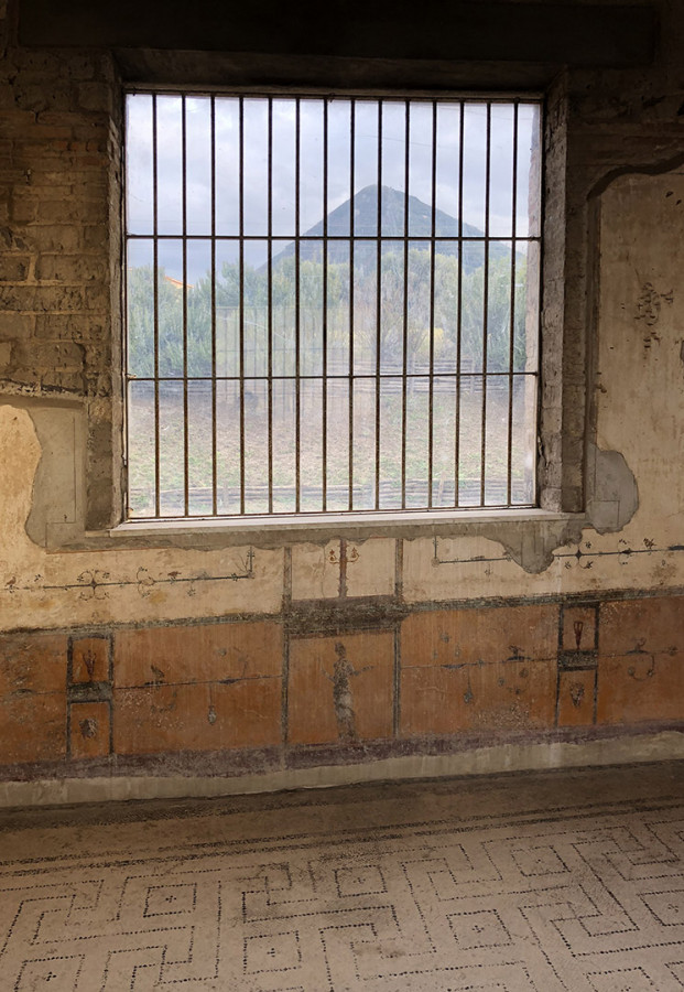 Dalla sua posizione collinare, la Villa (sito oggi di competenza del Parco Archeologico di Pompei) consente allo sguardo di spaziare sul golfo di Napoli: dallo scoglio di Rovigliano, la Petra Herculis di fondazione mitica, fino al profilo del Vesuvio, che si erge sullo sfondo. Da Villa Arianna, con un colpo d’occhio, il paesaggio circostante mostra inscritta nella sua conformazione non solo la storia geologica ma anche quella antropologica, sedimentatasi nel corso dei secoli. Come in un vero e proprio carotaggio verticale che, se comprende in lontananza i rilievi del vulcano e la superficie del mare, è occupato al centro da un paesaggio contemporaneo densamente popolato e caoticamente urbanizzato, definito dalle secolari trasformazioni storico-urbanistiche, non ultima la speculazione edilizia dei comuni vesuviani. La vista dal belvedere di Villa Arianna offre così una mappatura, fra magnificenza e scempio, della presenza umana sulla piana vesuviana: le facciate primo-novecentesche e le torri edificate negli anni ‘60 e ‘70sul lungomare e, più in lontananza, le ville settecentesche del Miglio d’Oro; l’abusivismo edilizio a cavallo fra XIX e XX secolo che, senza soluzione di continuità, riempie i vuoti una volta lasciati alla natura. Nemmeno l’attuale “zona rossa” – l’area che andrebbe distrutta in un’ipotetica, futura eruzione del Vesuvio – è libera da villette, capannoni e caseggiati. All’orizzonte, oltre la massa imponente del Vesuvio, Napoli e la collina di Posillipo.