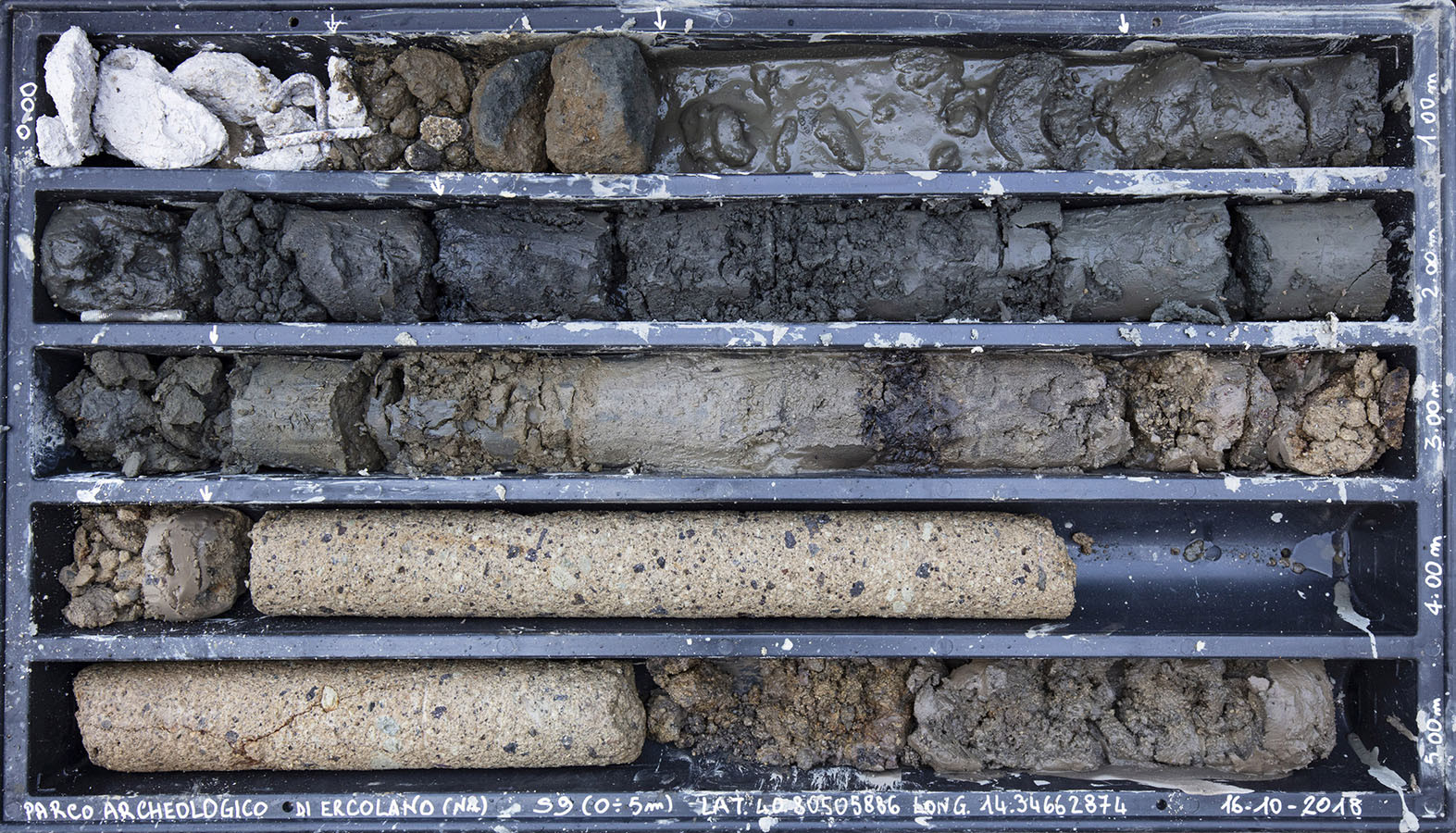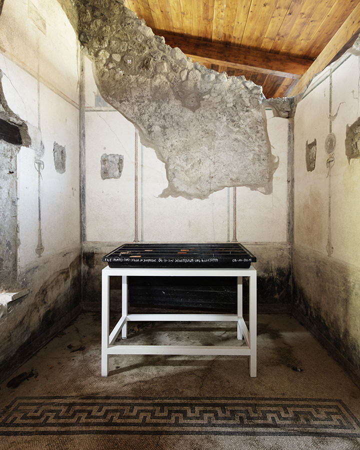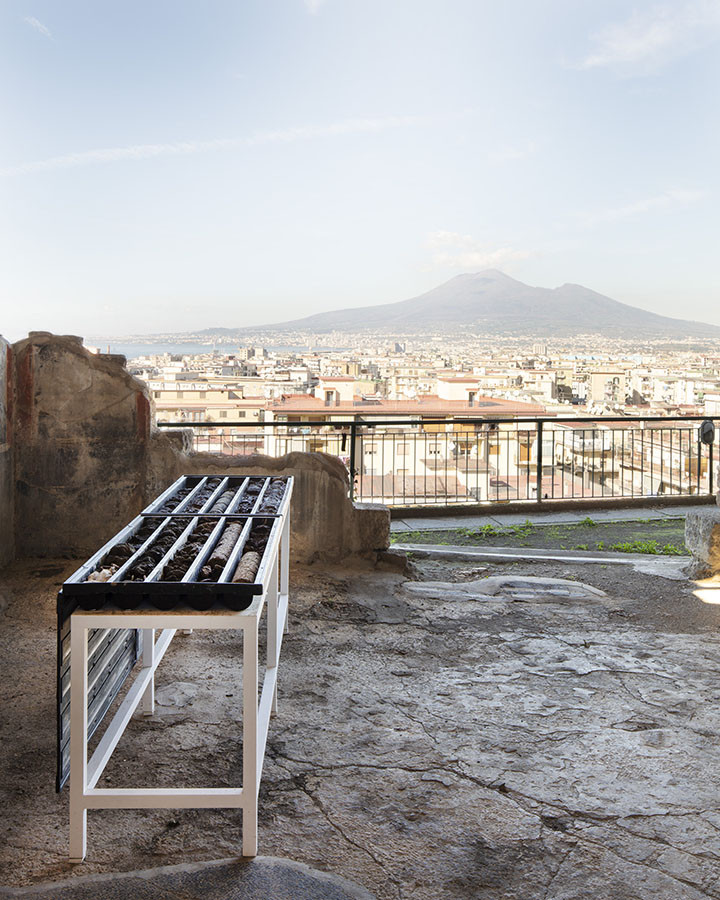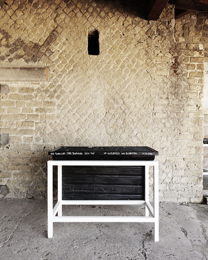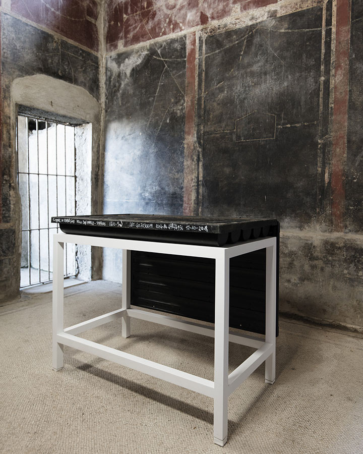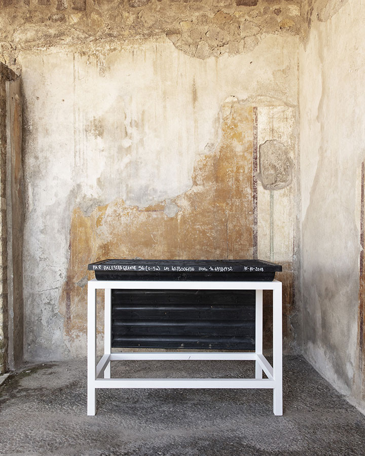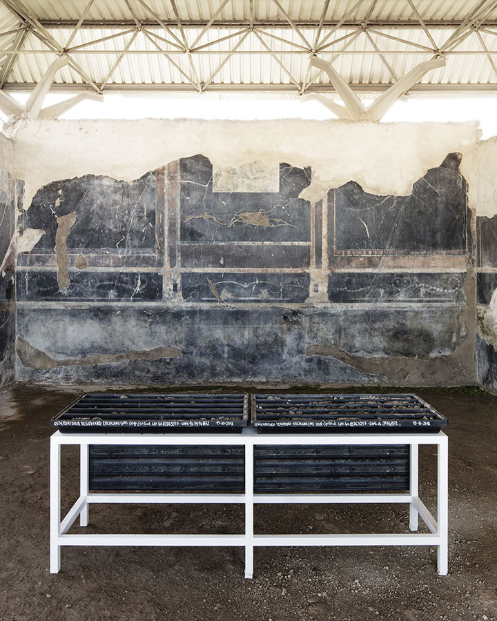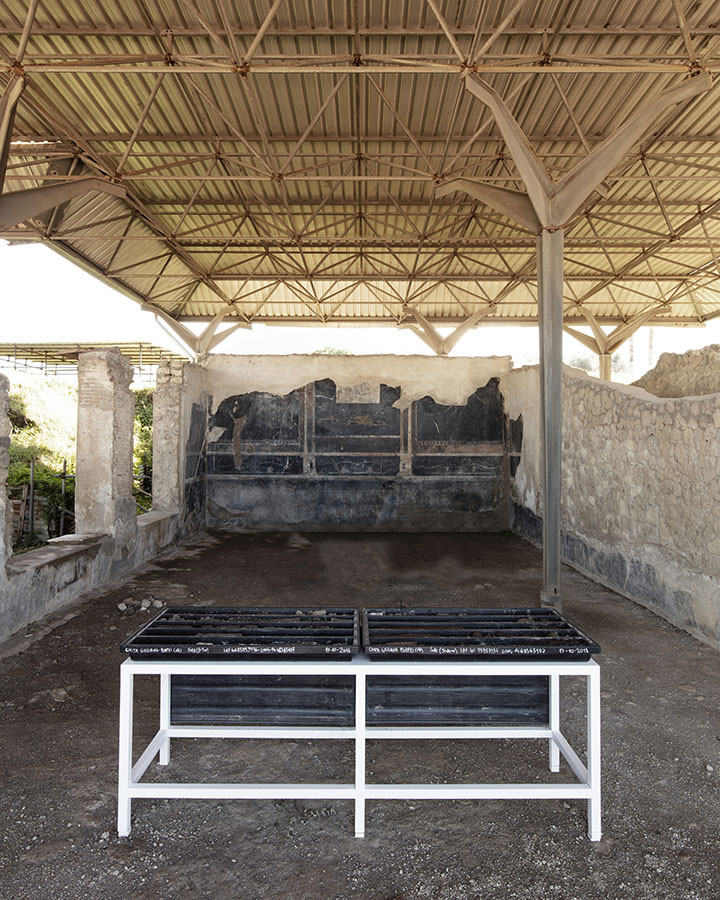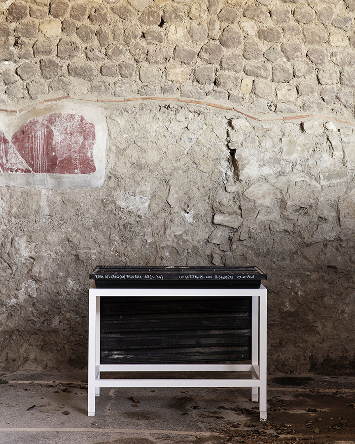 I carotaggi eseguiti nel contesto del progetto sono stati esposti in occasione della mostra DIGGING UP. ATLAS OF THE BLANK HISTORIES/Indagare il sottosuolo. Atlante delle storie omesse (25.10-18.11.2018). Dislocati nei vari ambienti della villa, contenuti all’interno delle loro scatole standard per la conservazione e adagiati su diversi tavoli, i carotaggi rendono visibile e tangibile la profonda stratificazione del territorio circostante. Come timeline orizzontali, essi consentono una lettura delle storie che si sono impresse nel terreno nel corso dei secoli: il rinvenimento nel 1936 dell’enigmatico quadrato magico (con l’iscrizione TENET) su una colonna della Palestra Grande dell’antica Pompei; il Foro Triangolare dove la leggenda vuole che sia situata la mitica tomba di Ercole, l’Heroon, ma anche il Tempio di Iside (II secolo a.C.), la cui scoperta nel 1764 ha dato impulso all’egittologia e all’occultismo che ha conosciuto una grande diffusione all’epoca in Europa condizionandone il gusto; il Santuario extra urbano di Fondo Iozzino dove il culto pagano antico, testimoniato dai numerosi ex-voto, risalenti alla fine del VII secolo a.C., costituiti da oggetti miniaturistici – vasetti, calici e coppette – per le libagioni, si intreccia al culto cattolico della Madonna del Rosario con gli ex-voto devozionali custoditi nell’ottocentesco Santuario, mostrando la rottura ma anche la continuità dei culti.