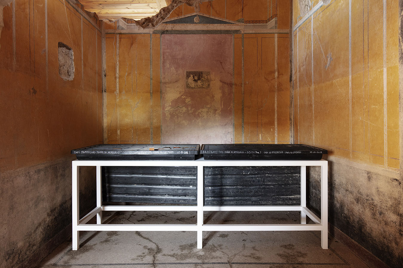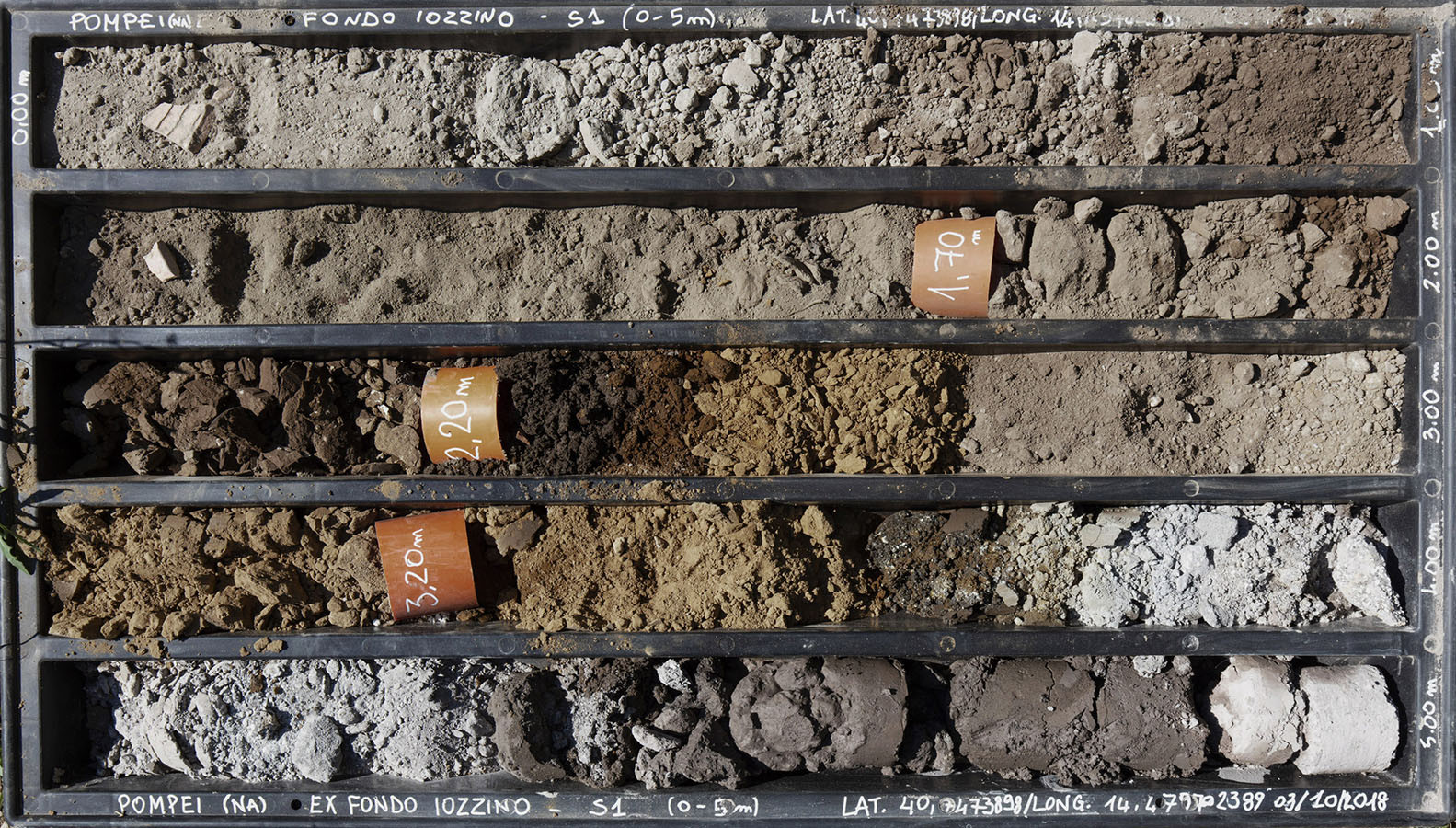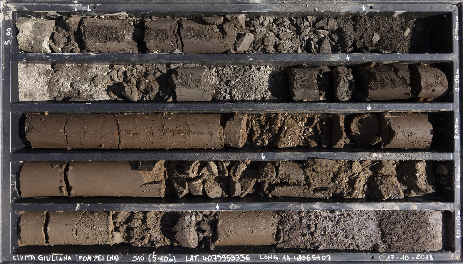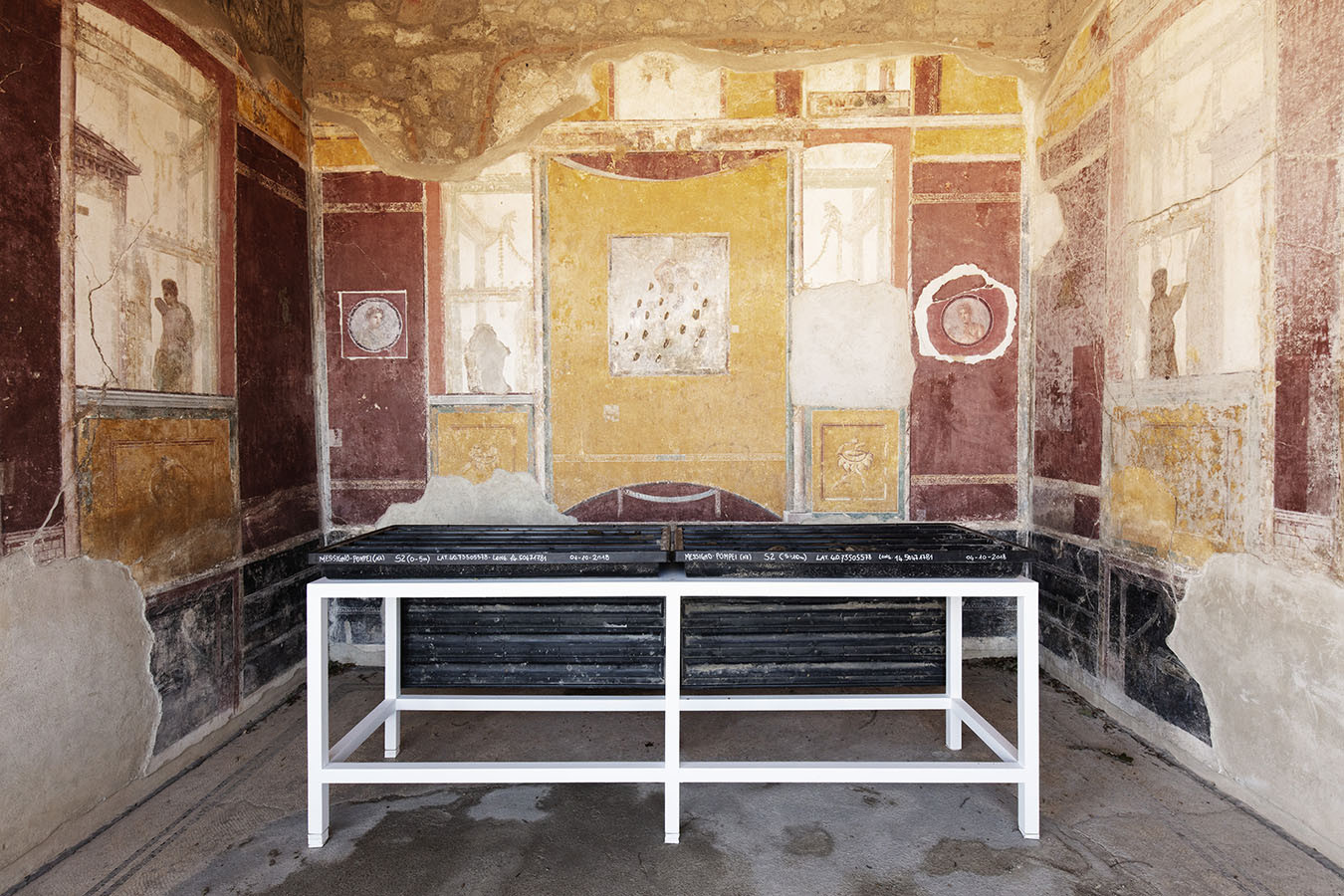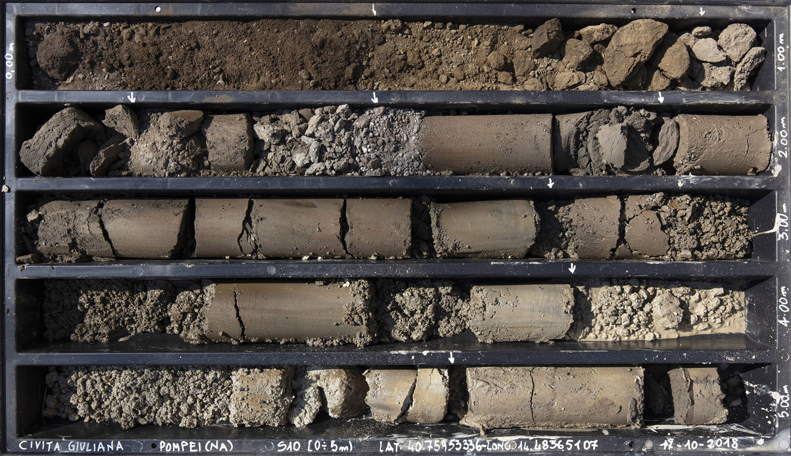 I carotaggi eseguiti nel contesto del progetto sono stati esposti in occasione della mostra DIGGING UP. ATLAS OF THE BLANK HISTORIES/Indagare il sottosuolo. Atlante delle storie omesse (25.10-18.11.2018). Dislocati nei vari ambienti della villa, contenuti all’interno delle loro scatole standard per la conservazione e adagiati su diversi tavoli, i carotaggi rendono visibile e tangibile la profonda stratificazione del territorio circostante. Come timeline orizzontali, essi consentono una lettura delle storie che si sono impresse nel terreno nel corso dei secoli: il rinvenimento nel 1936 dell’enigmatico quadrato magico (con l’iscrizione TENET) su una colonna della Palestra Grande dell’antica Pompei; il Foro Triangolare dove la leggenda vuole che sia situata la mitica tomba di Ercole, l’Heroon, ma anche il Tempio di Iside (II secolo a.C.), la cui scoperta nel 1764 ha dato impulso all’egittologia e all’occultismo che ha conosciuto una grande diffusione all’epoca in Europa condizionandone il gusto; il Santuario extra urbano di Fondo Iozzino dove il culto pagano antico, testimoniato dai numerosi ex-voto, risalenti alla fine del VII secolo a.C., costituiti da oggetti miniaturistici – vasetti, calici e coppette – per le libagioni, si intreccia al culto cattolico della Madonna del Rosario con gli ex-voto devozionali custoditi nell’ottocentesco Santuario, mostrando la rottura ma anche la continuità dei culti.