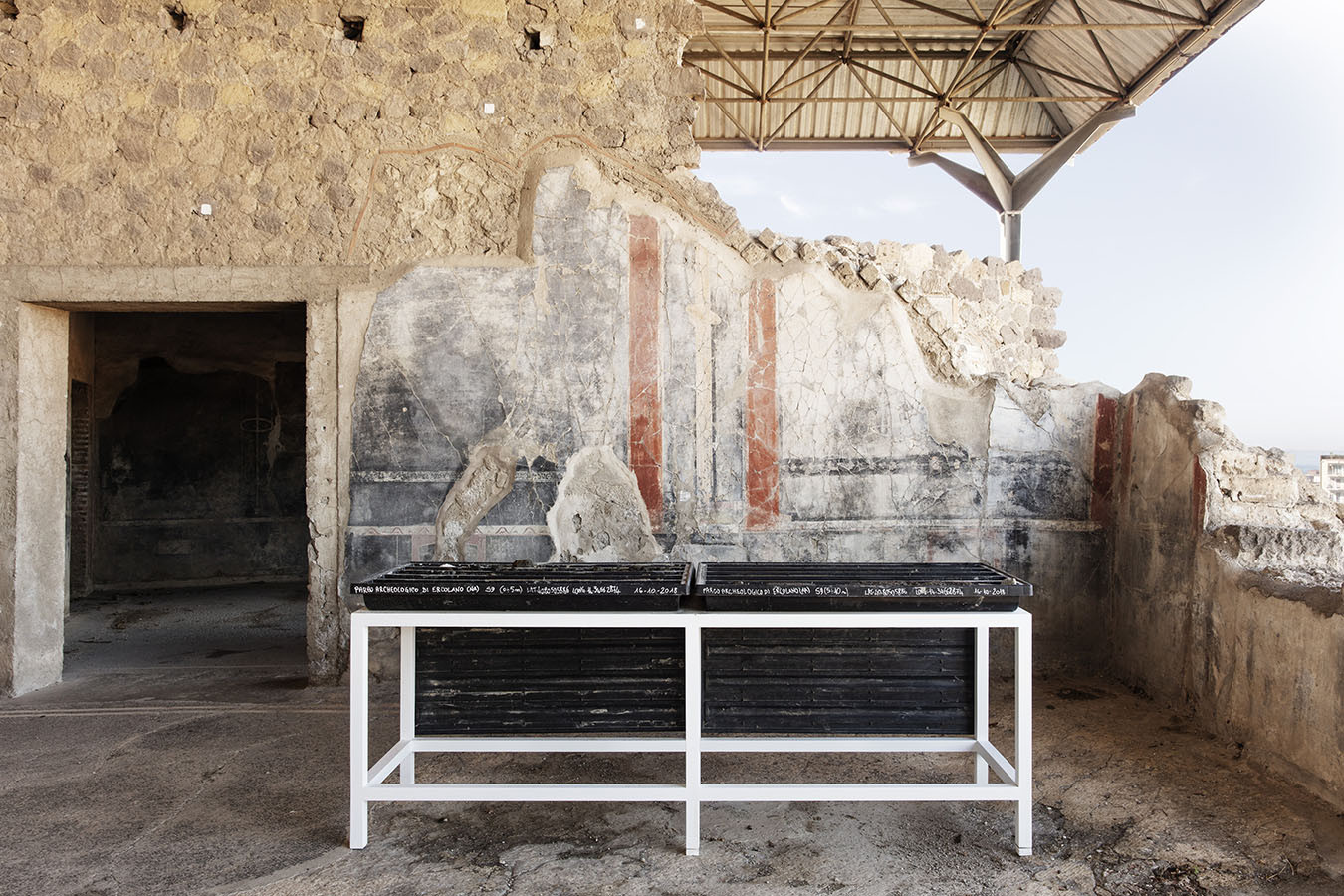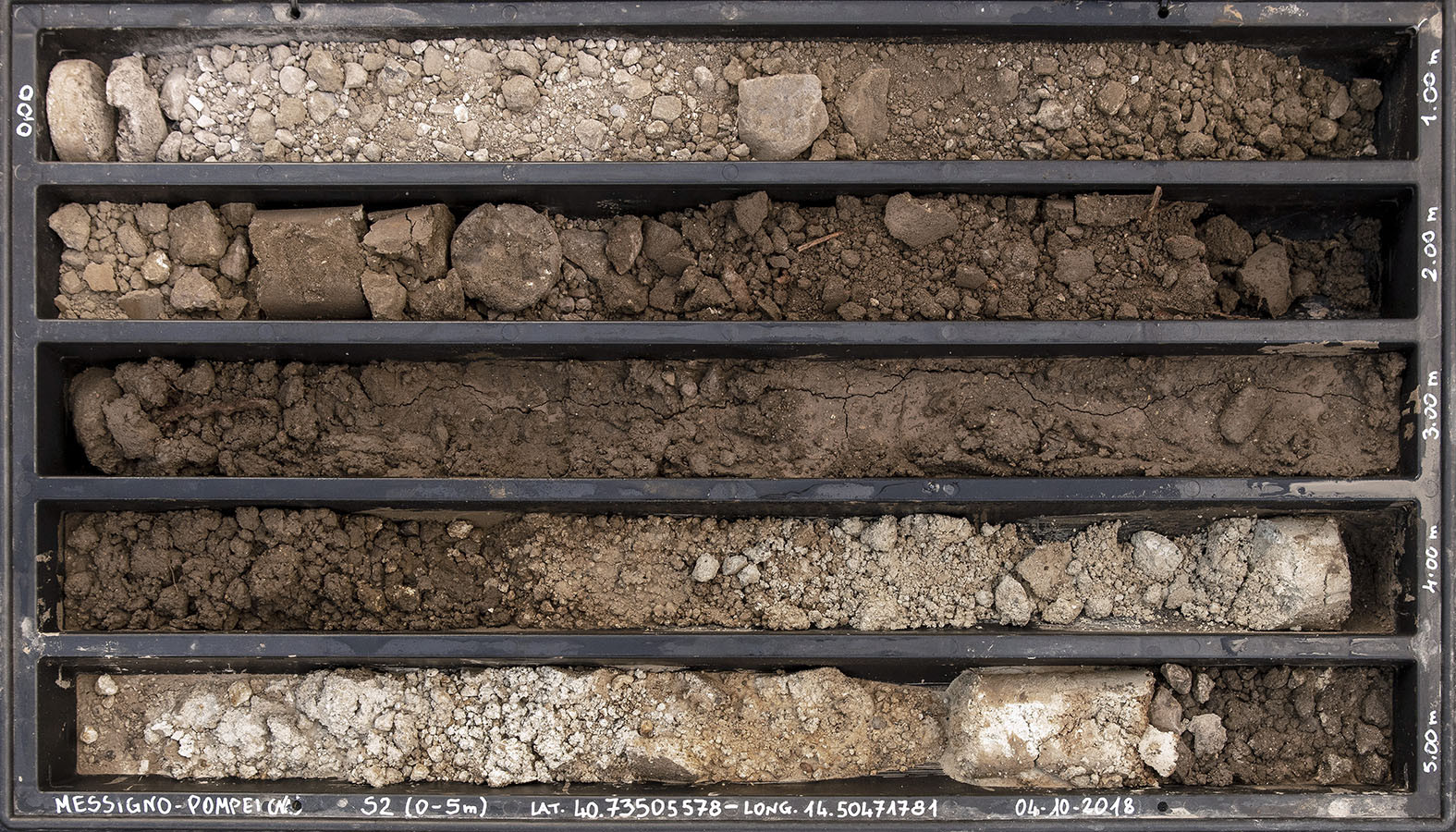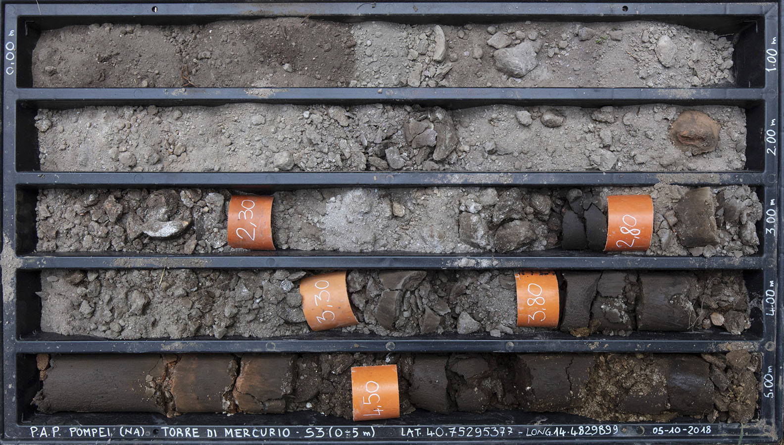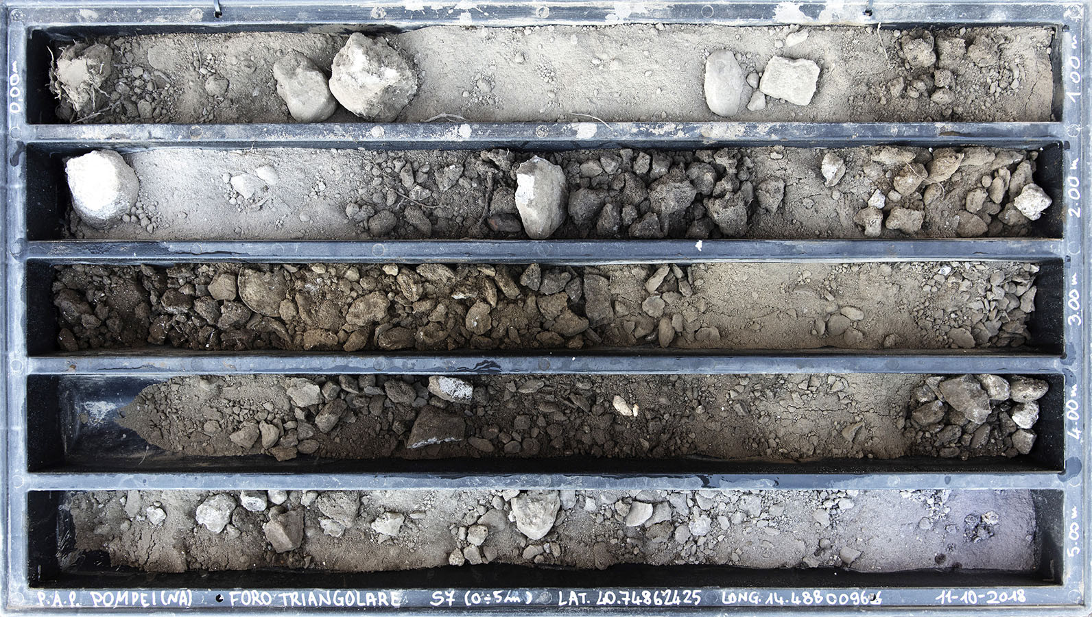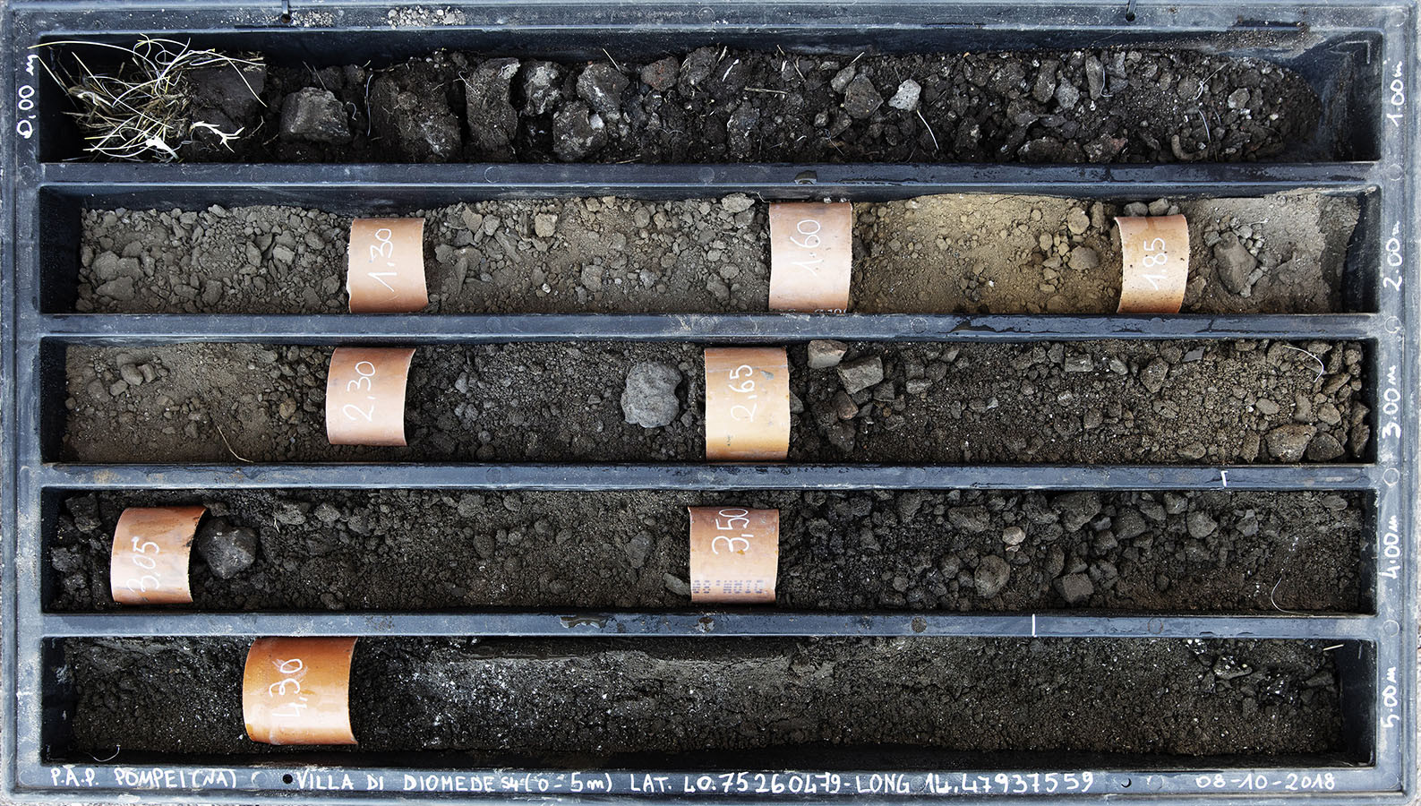 I carotaggi eseguiti nel contesto del progetto sono stati esposti in occasione della mostra DIGGING UP. ATLAS OF THE BLANK HISTORIES/Indagare il sottosuolo. Atlante delle storie omesse (25.10-18.11.2018). Dislocati nei vari ambienti della villa, contenuti all’interno delle loro scatole standard per la conservazione e adagiati su diversi tavoli, i carotaggi rendono visibile e tangibile la profonda stratificazione del territorio circostante. Come timeline orizzontali, essi consentono una lettura delle storie che si sono impresse nel terreno nel corso dei secoli: il rinvenimento nel 1936 dell’enigmatico quadrato magico (con l’iscrizione TENET) su una colonna della Palestra Grande dell’antica Pompei; il Foro Triangolare dove la leggenda vuole che sia situata la mitica tomba di Ercole, l’Heroon, ma anche il Tempio di Iside (II secolo a.C.), la cui scoperta nel 1764 ha dato impulso all’egittologia e all’occultismo che ha conosciuto una grande diffusione all’epoca in Europa condizionandone il gusto; il Santuario extra urbano di Fondo Iozzino dove il culto pagano antico, testimoniato dai numerosi ex-voto, risalenti alla fine del VII secolo a.C., costituiti da oggetti miniaturistici – vasetti, calici e coppette – per le libagioni, si intreccia al culto cattolico della Madonna del Rosario con gli ex-voto devozionali custoditi nell’ottocentesco Santuario, mostrando la rottura ma anche la continuità dei culti.