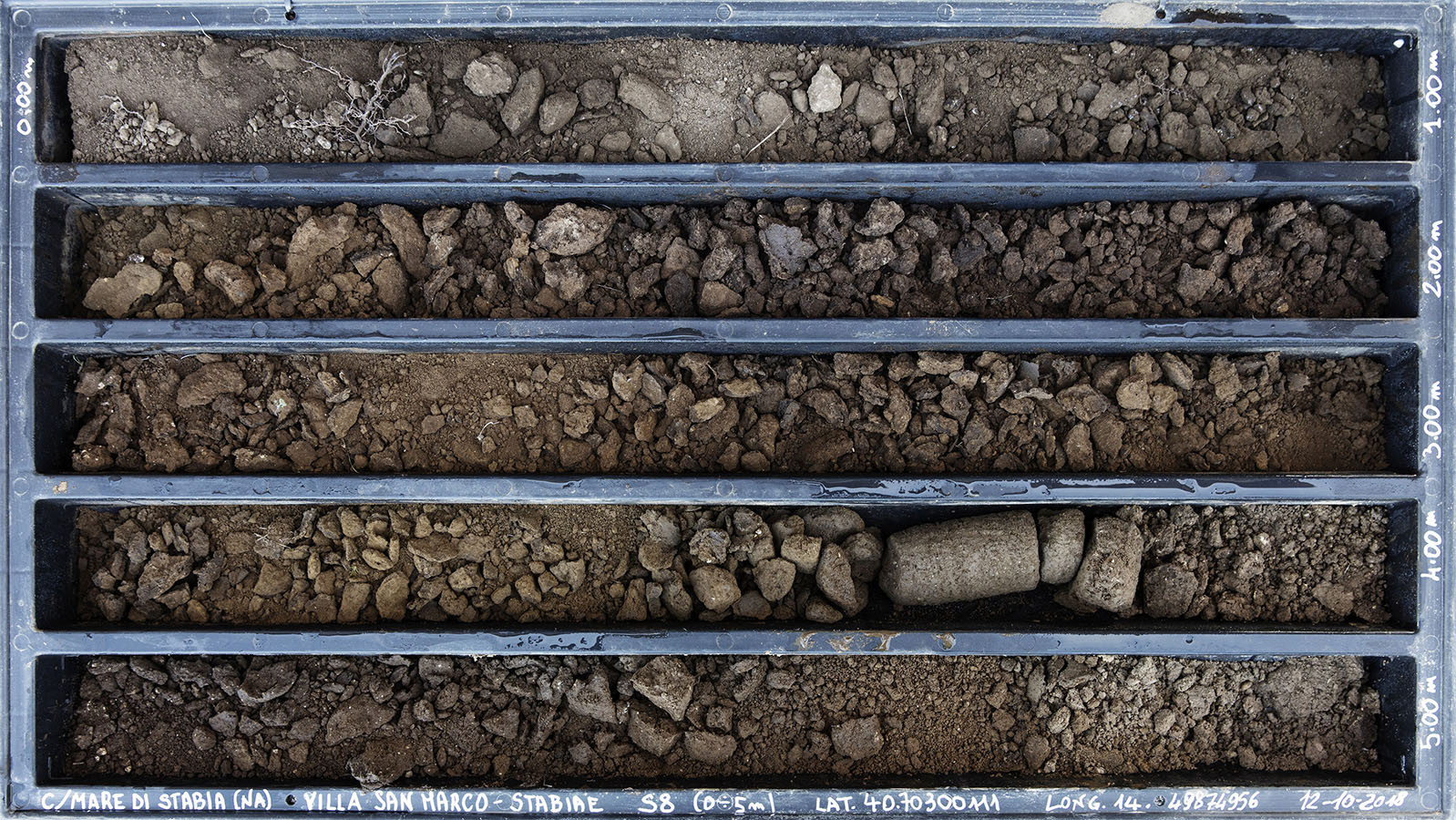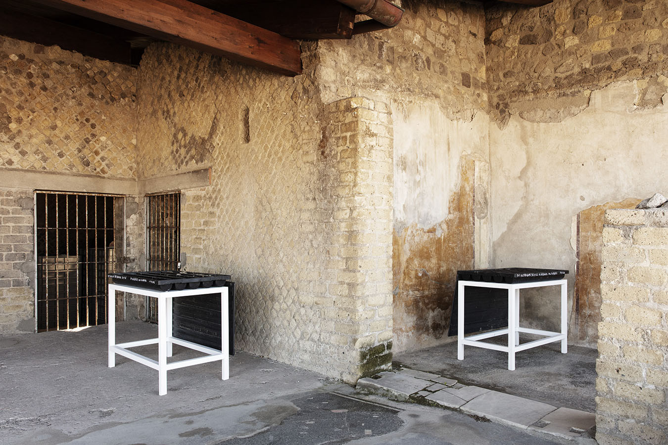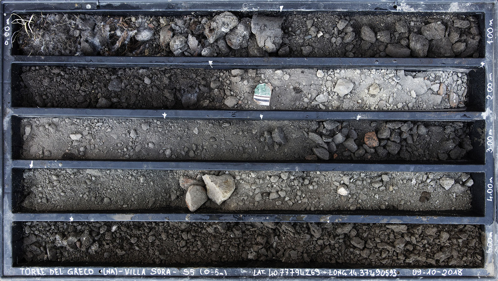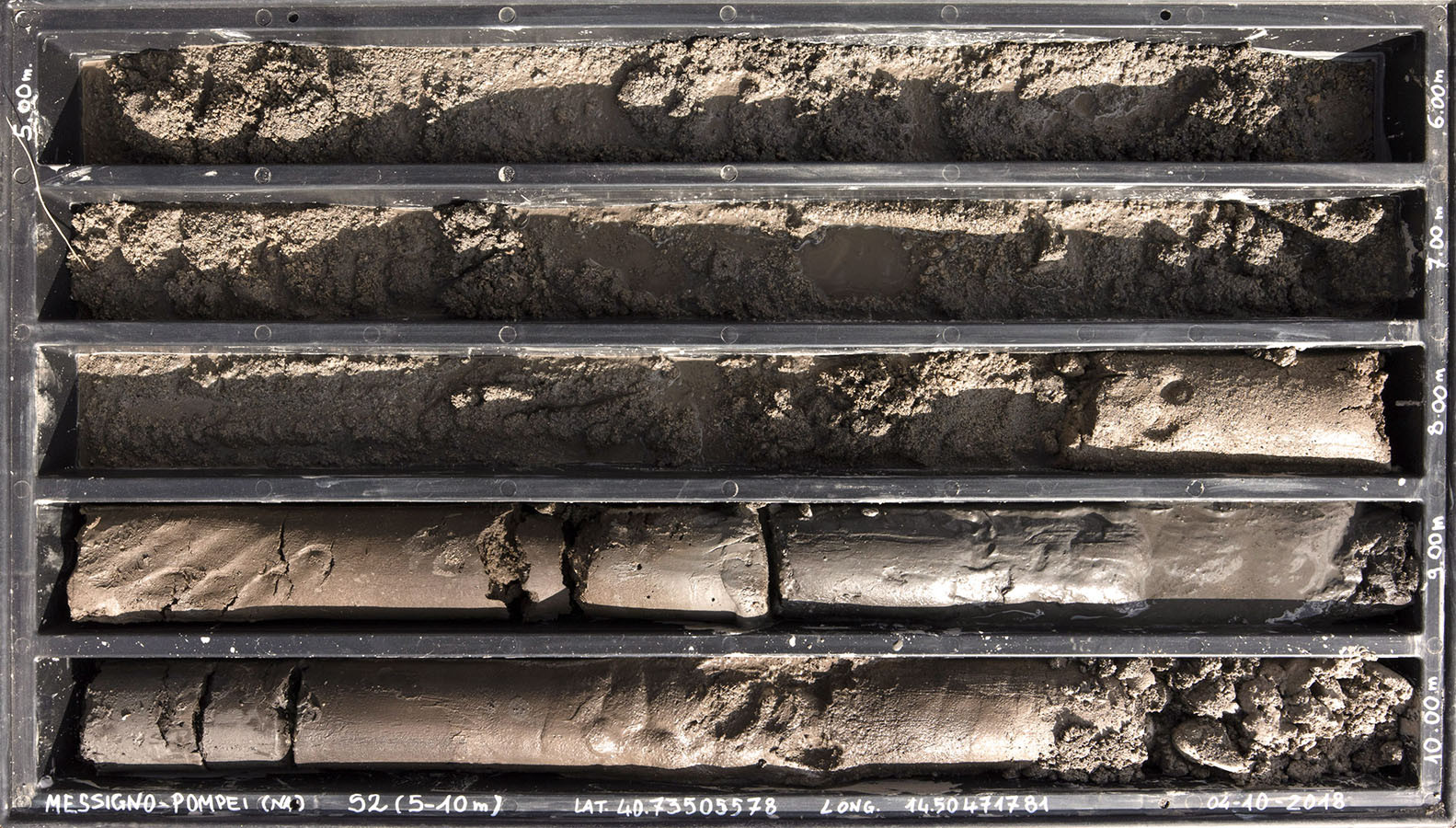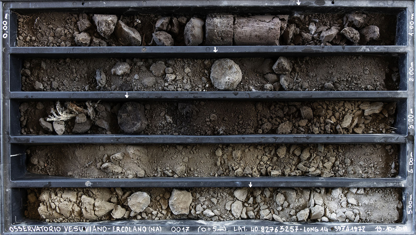 I carotaggi eseguiti nel contesto del progetto sono stati esposti in occasione della mostra DIGGING UP. ATLAS OF THE BLANK HISTORIES/Indagare il sottosuolo. Atlante delle storie omesse (25.10-18.11.2018). Dislocati nei vari ambienti della villa, contenuti all’interno delle loro scatole standard per la conservazione e adagiati su diversi tavoli, i carotaggi rendono visibile e tangibile la profonda stratificazione del territorio circostante. Come timeline orizzontali, essi consentono una lettura delle storie che si sono impresse nel terreno nel corso dei secoli: il rinvenimento nel 1936 dell’enigmatico quadrato magico (con l’iscrizione TENET) su una colonna della Palestra Grande dell’antica Pompei; il Foro Triangolare dove la leggenda vuole che sia situata la mitica tomba di Ercole, l’Heroon, ma anche il Tempio di Iside (II secolo a.C.), la cui scoperta nel 1764 ha dato impulso all’egittologia e all’occultismo che ha conosciuto una grande diffusione all’epoca in Europa condizionandone il gusto; il Santuario extra urbano di Fondo Iozzino dove il culto pagano antico, testimoniato dai numerosi ex-voto, risalenti alla fine del VII secolo a.C., costituiti da oggetti miniaturistici – vasetti, calici e coppette – per le libagioni, si intreccia al culto cattolico della Madonna del Rosario con gli ex-voto devozionali custoditi nell’ottocentesco Santuario, mostrando la rottura ma anche la continuità dei culti.