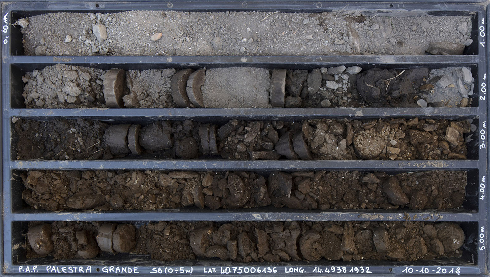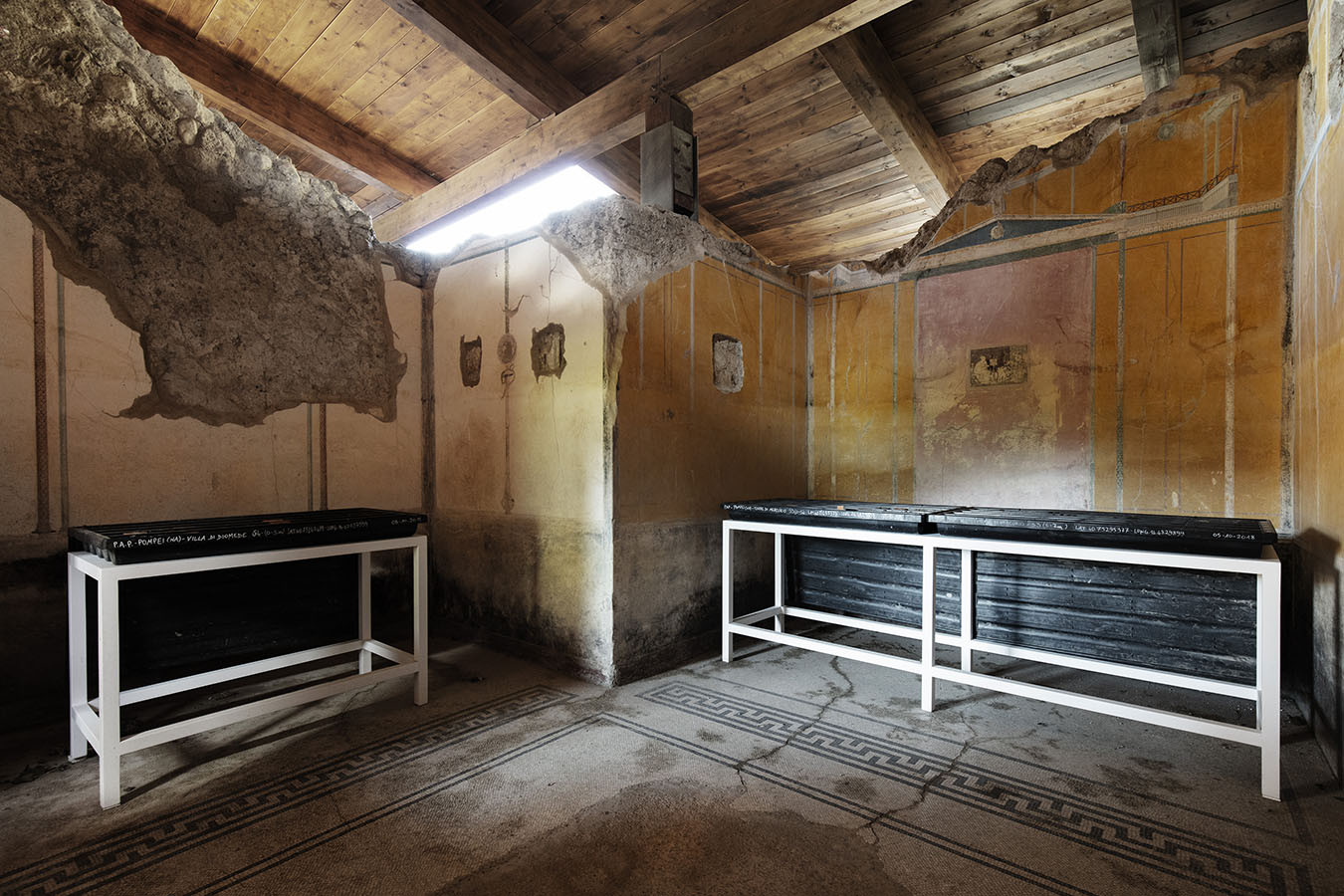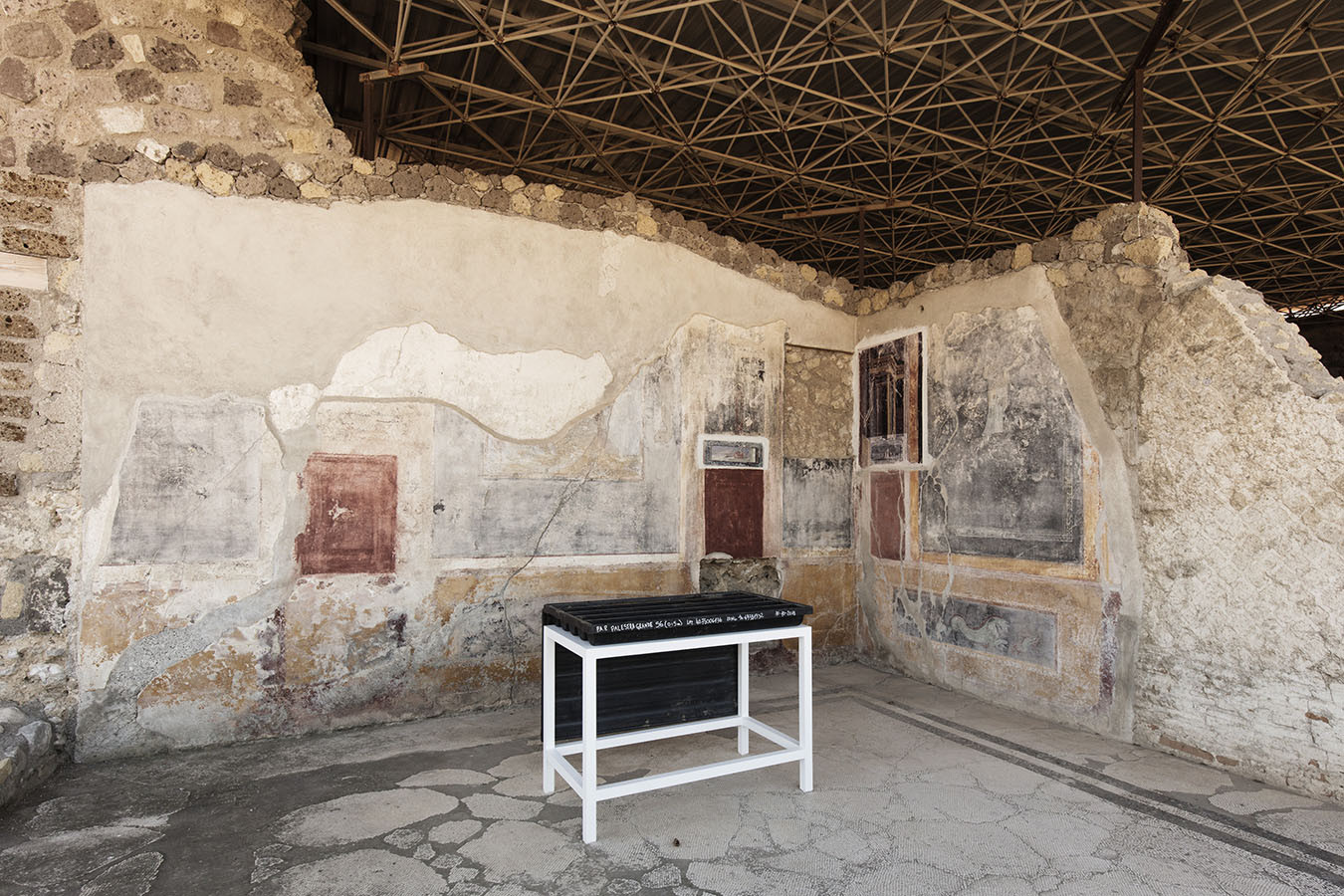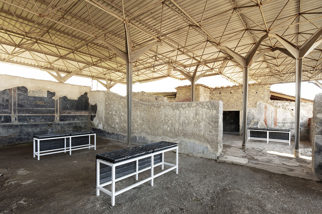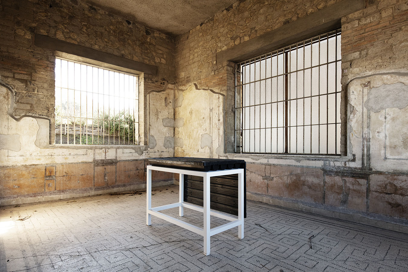 I carotaggi eseguiti nel contesto del progetto sono stati esposti in occasione della mostra DIGGING UP. ATLAS OF THE BLANK HISTORIES/Indagare il sottosuolo. Atlante delle storie omesse (25.10-18.11.2018). Dislocati nei vari ambienti della villa, contenuti all’interno delle loro scatole standard per la conservazione e adagiati su diversi tavoli, i carotaggi rendono visibile e tangibile la profonda stratificazione del territorio circostante. Come timeline orizzontali, essi consentono una lettura delle storie che si sono impresse nel terreno nel corso dei secoli: il rinvenimento nel 1936 dell’enigmatico quadrato magico (con l’iscrizione TENET) su una colonna della Palestra Grande dell’antica Pompei; il Foro Triangolare dove la leggenda vuole che sia situata la mitica tomba di Ercole, l’Heroon, ma anche il Tempio di Iside (II secolo a.C.), la cui scoperta nel 1764 ha dato impulso all’egittologia e all’occultismo che ha conosciuto una grande diffusione all’epoca in Europa condizionandone il gusto; il Santuario extra urbano di Fondo Iozzino dove il culto pagano antico, testimoniato dai numerosi ex-voto, risalenti alla fine del VII secolo a.C., costituiti da oggetti miniaturistici – vasetti, calici e coppette – per le libagioni, si intreccia al culto cattolico della Madonna del Rosario con gli ex-voto devozionali custoditi nell’ottocentesco Santuario, mostrando la rottura ma anche la continuità dei culti.