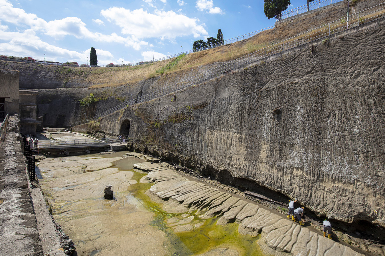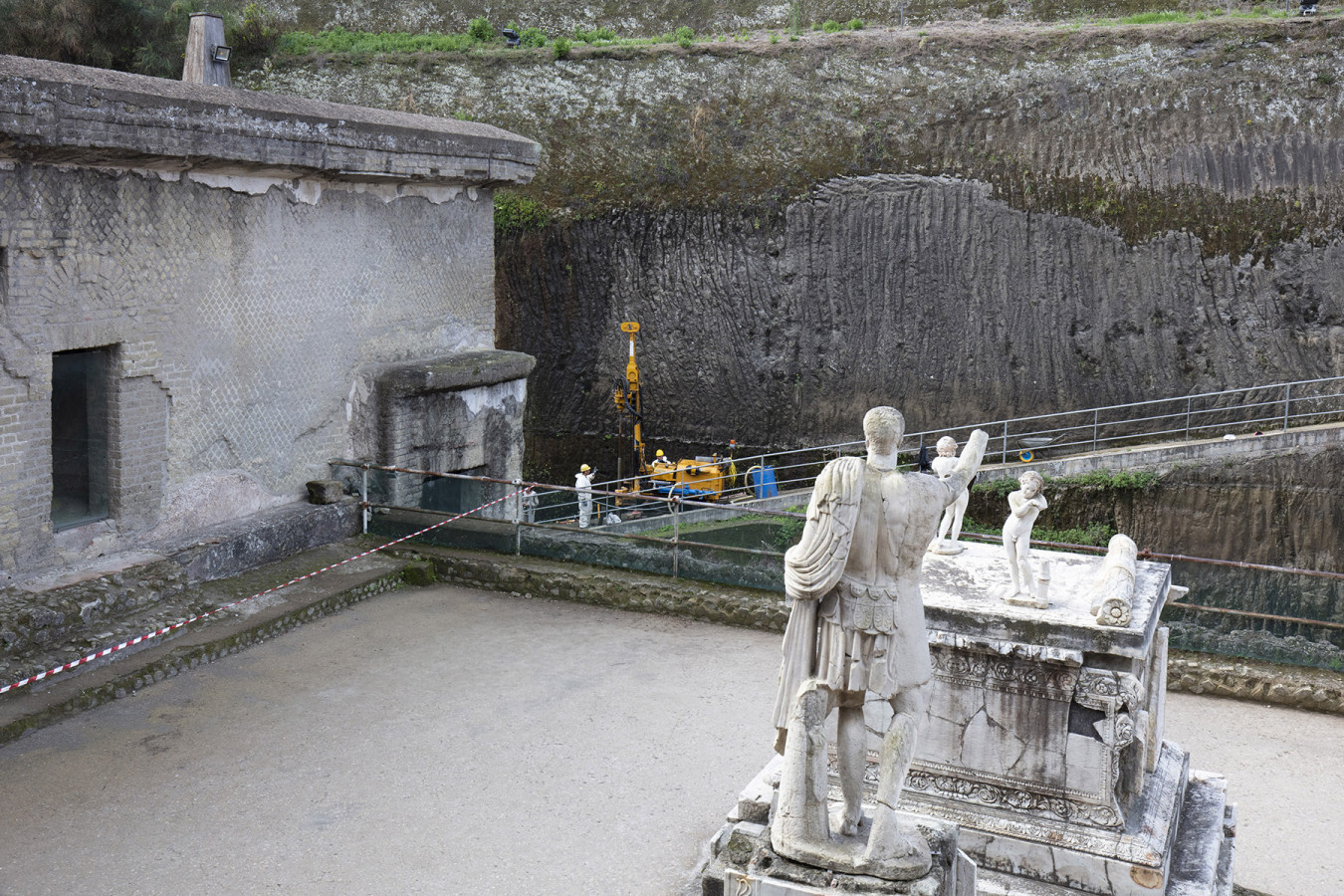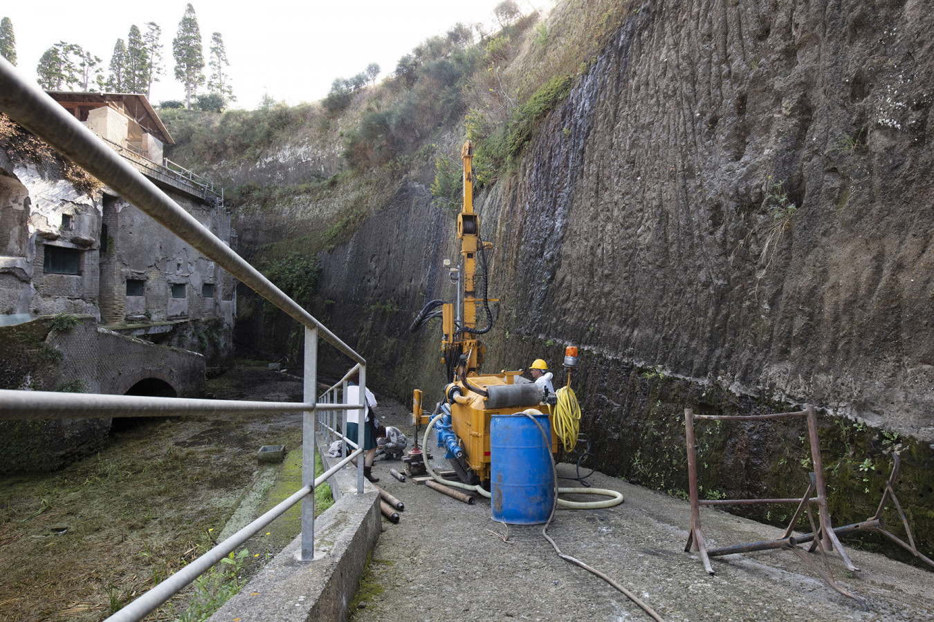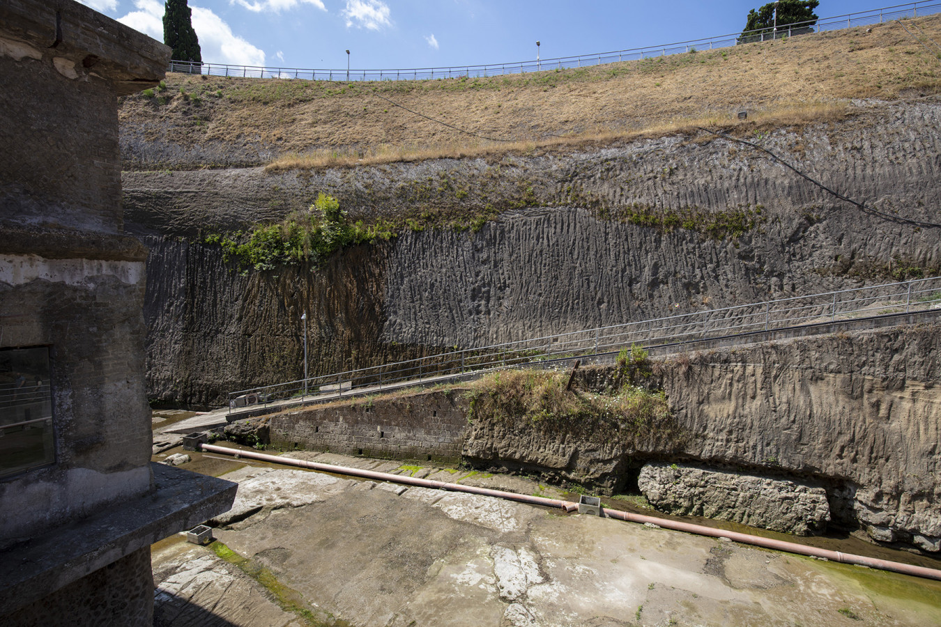 The 0015 core sampling site is in the archaeological area of the Herculaneum excavations, on the ramp that goes down to the pumping plant and to the coastal tuff platform on which the ancient beach had formed. Straight cuts and grooves on this platform have been identified as traces of ancient quarrying activities for the extraction of blocks of tuff used for building the city. Where it has been uncovered by archaeological excavations, the tuffaceous platform, which was once out of the water, is now about 6.5 m below sea level due to the subsidence of the ground caused by volcanic-tectonic phenomena. A pumping system removes the groundwater, which would otherwise fill the area.
