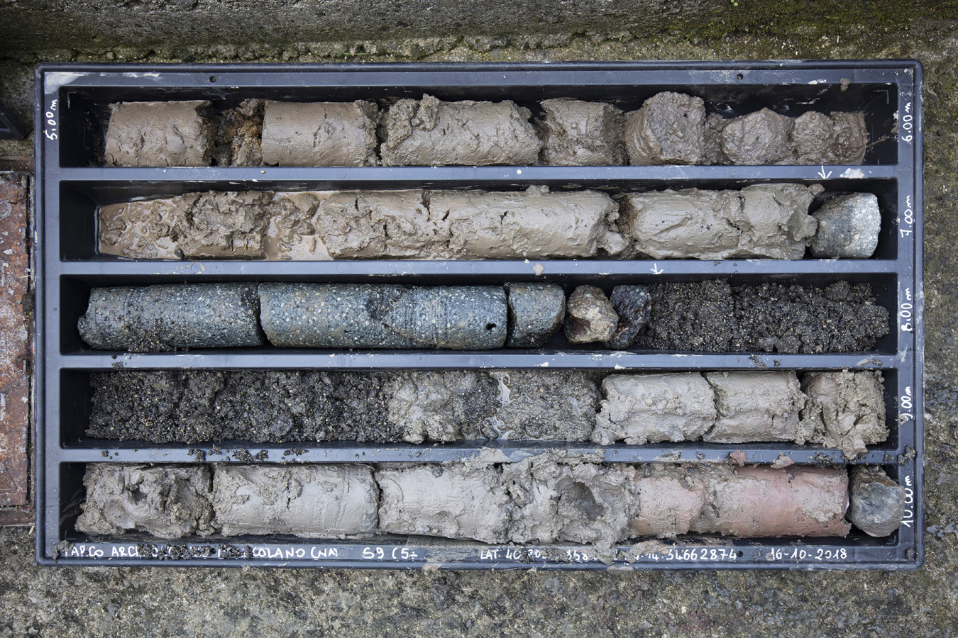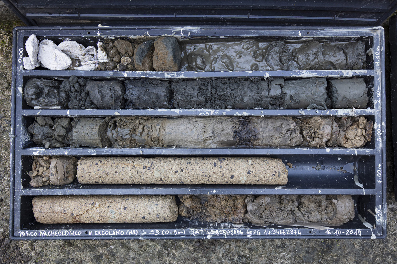 The ramp on which the core sampling site is located cuts through the deposits of the AD 79 eruption, which are exposed and clearly visible along the entire front of the excavation. The core sampling site is in the lower part of the ramp and thus goes only through the lower portion of the sequence, at -2.65 m below the paving of the ramp.
